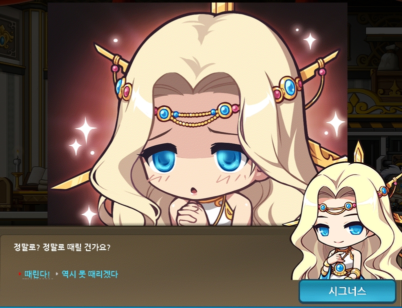 이렇게 변신했는데 설마 나를 때릴것이냐는 물음에 거침없이 고개를 끄덕거리며 때린다를 눌러줍니다.